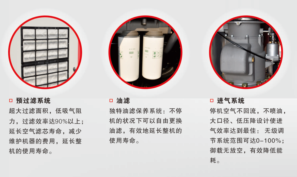 選擇意朗低壓螺桿空壓機,可付出少一半的電費,工藝系統中的供氣壓仍然能得以保證,并且實現了節能減排! 空濾芯:進口濾材,過濾精度高,加大過濾面積,有效降低吸氣阻力:增加了安全濾芯、旋風過濾器,有效的提高了安全系數和過濾效率。 油細分離芯:加大的油細分離芯,使過濾面積成倍增加,在壓力較低的情況下,保證了壓縮空氣極低的含油量。 油氣分離器:嚴格計算氣流流速、通流面積加大、沉降分離時間加長,分離效率達99%以上。 增強型油濾:適應惡劣工況,更有效地濾除潤滑油中的雜質及劣化物,更大限度的確保主機使用壽命。